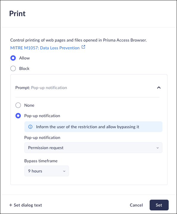 • Allow - the Prisma Browser will permit printing of webpages and files opened in the Prisma Access Browser.