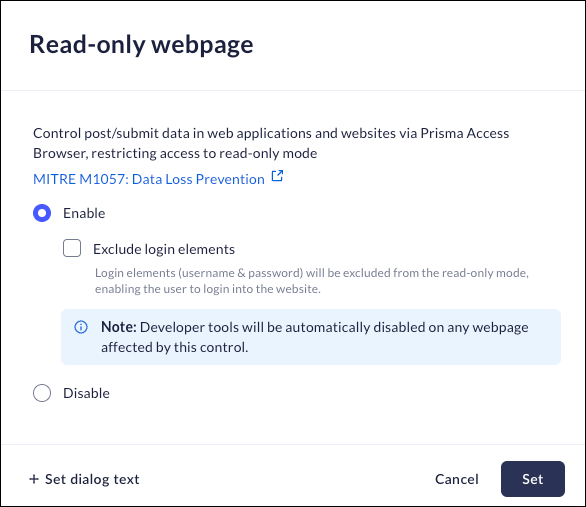 • Enable - the Prisma Browser will allow users to read and download the information on web applications but won't allow users to input information to any editable part of the page. Developer tools will be disabled on any webpage affected by this control.