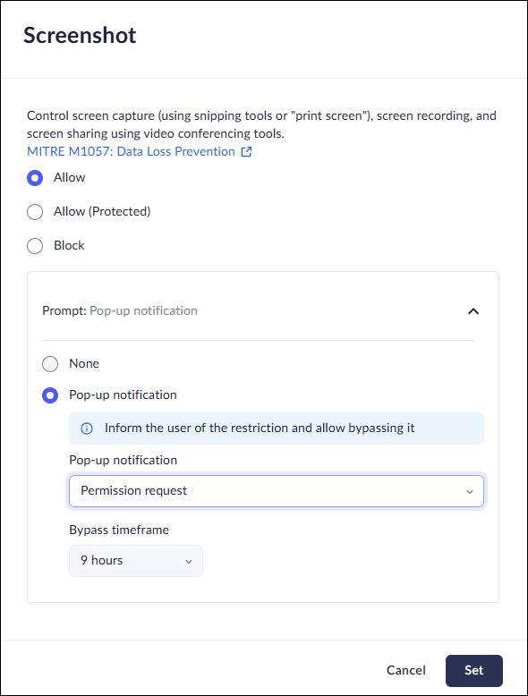 This feature controls whether or not users can take screenshots (using snipping tools or Print Screen), record the screen, or share the screen with video conferencing tools from websites that match the URL, application, or category in the rule. To set the Screenshot control:
