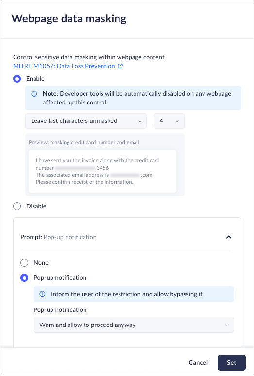 • Warn and allow to proceed anyway with a reason - the prompt will freeze the sensitive information until the user acknowledges the message and selects a reason.