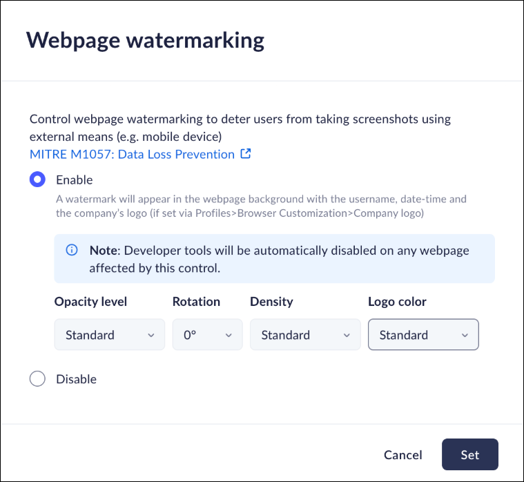 • Enable - The Prisma Browser will display the watermark information to deter users from taking pictures.