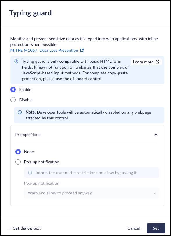 Scans manual input made by users in real-time within the browser. It operates based on defined rules that can be customized based on specific organizational requirements. To set the Typing Guard control: