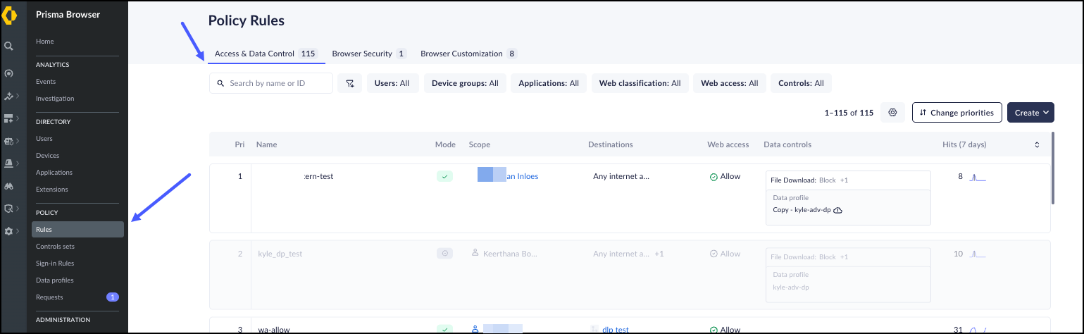 Manage Prisma Browser Access and Data Control Rules