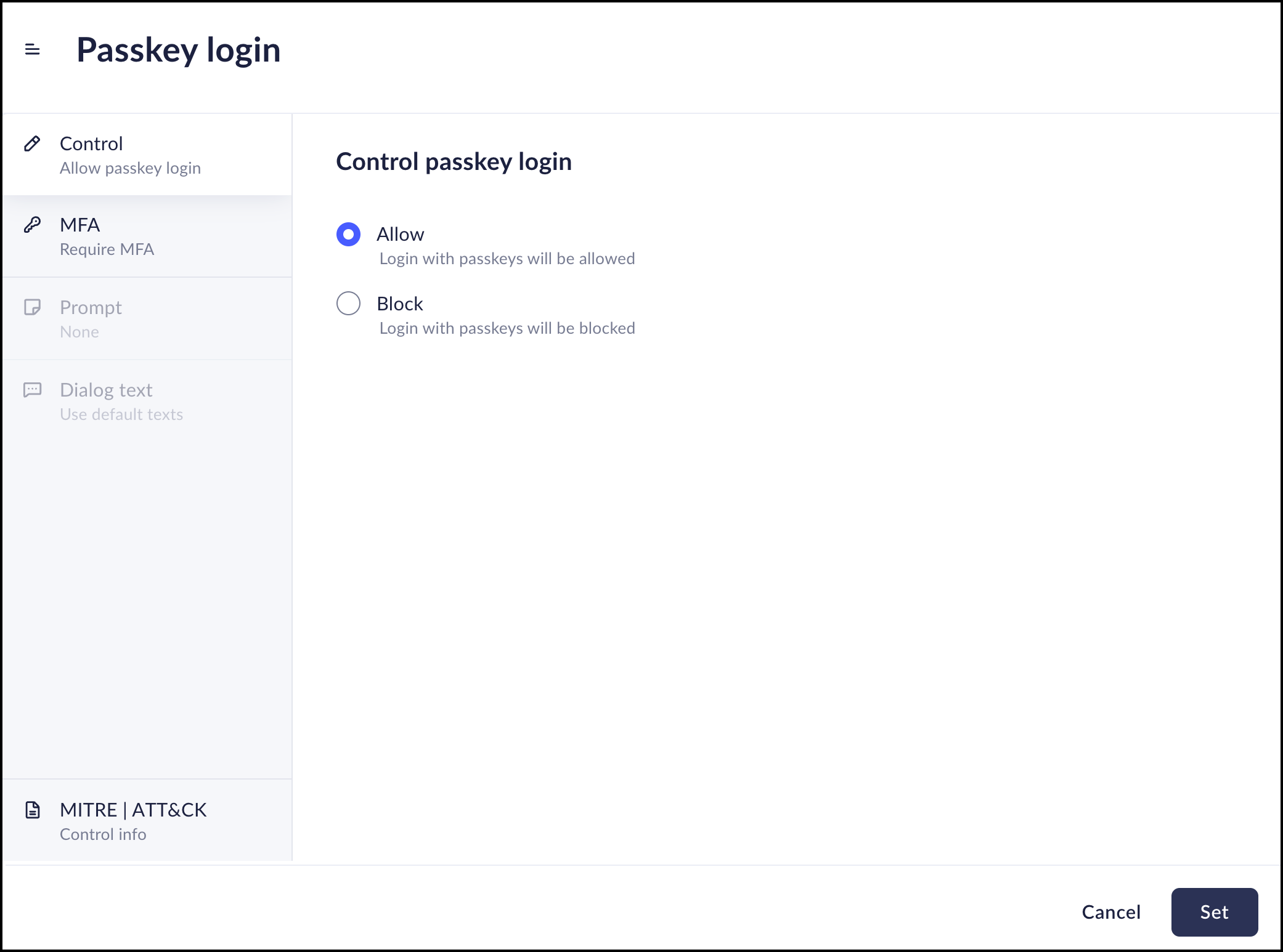 Click on the Passkey login tab to open Control Passkey login, and select one of the following options:- Allow - Logins using Passkeys will be permitted.Block - Logins with Passkeys will be blocked.
