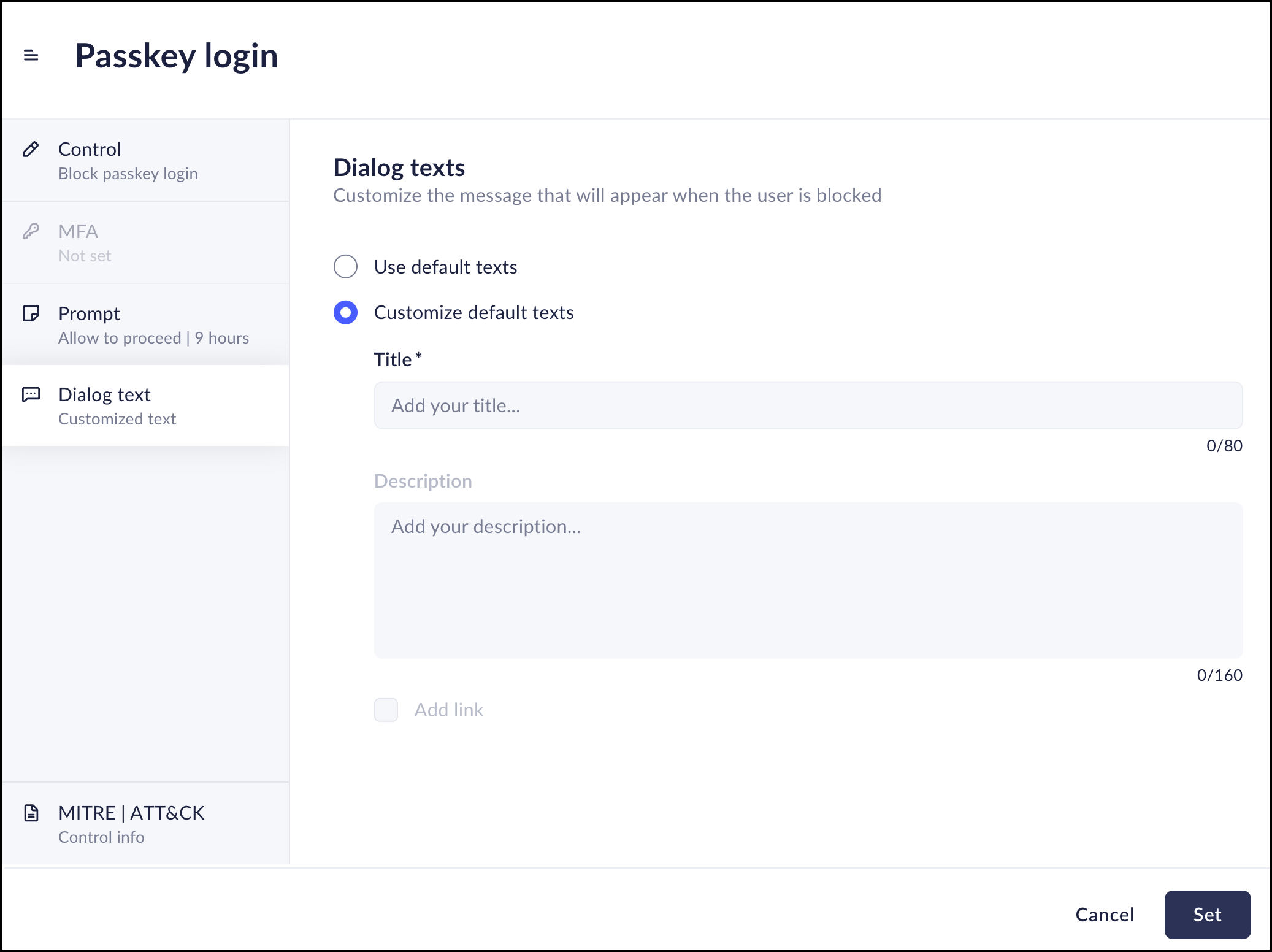If you want to configure a custom Dialog text that will appear when the user is blocked, do the following:- Click Dialog text.Select one of the following options: