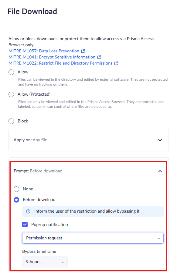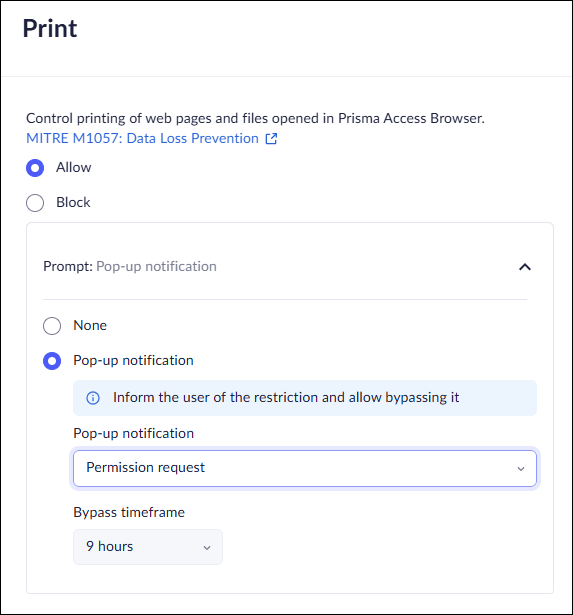 To address this issue, Prisma Browser allows you to set up temporarily bypass rules conditions. For each supported control, you can configure a policy that allows your users to bypass the rule.