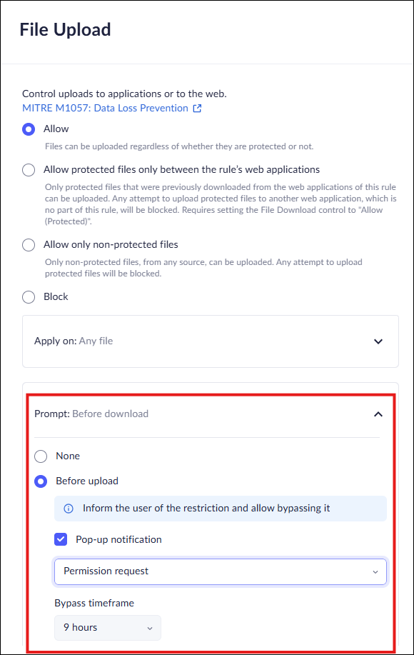 The File Upload profile in Access & Data Control rules allows you to restrict file uploads. This option is available from either the Profiles or from the Data controls, but we recommend using the Data controls to manage policies.