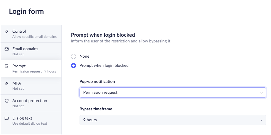 4. Select Prompt when the login is blocked - With this setting enabled, when users attempt to login using a restricted email, Prisma Browser notifies them. You can set the following bypass conditions: