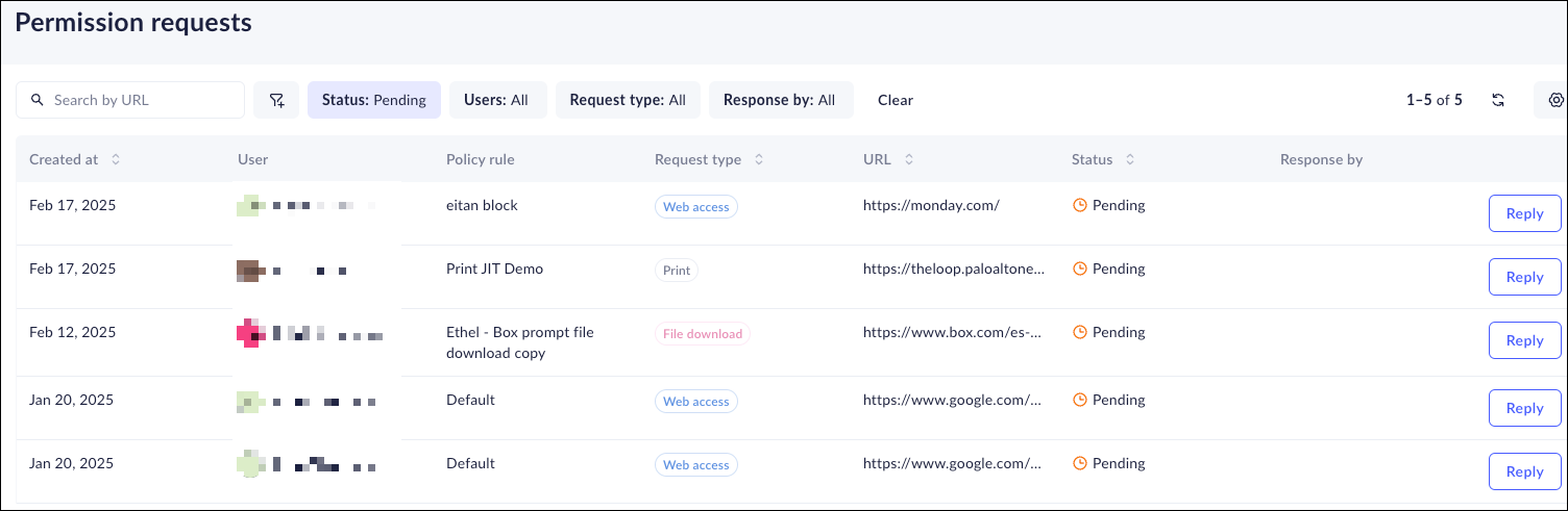 If you have configured bypass conditions on your policy rules and you find that you are approving similar requests, this might indicate that you need to tune your policy rules. You can investigate current and past bypass rules to assess whether you need to make some adjustments to your policy on the ConfigurationPrisma Browser PolicyRequests page.