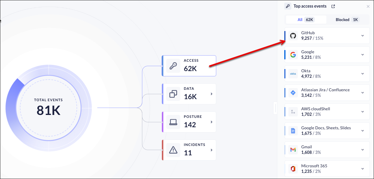 - Access events—Access events display the information regarding the applications/URLs that Prisma Browser users are using most.