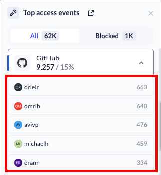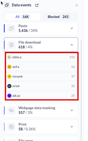 Click into one of the data events.From here, you can see which users are using the selected data operation most frequently.