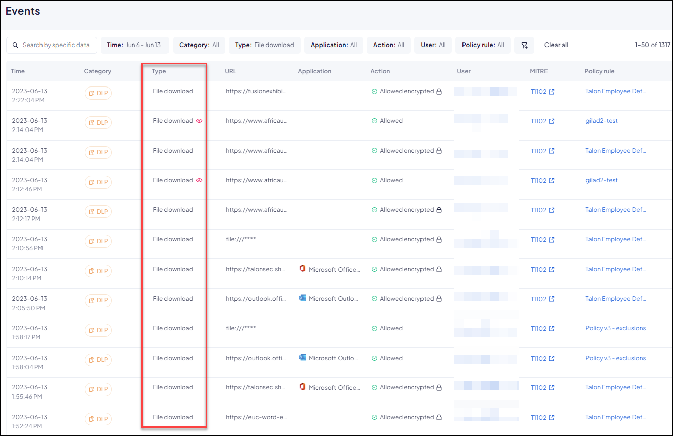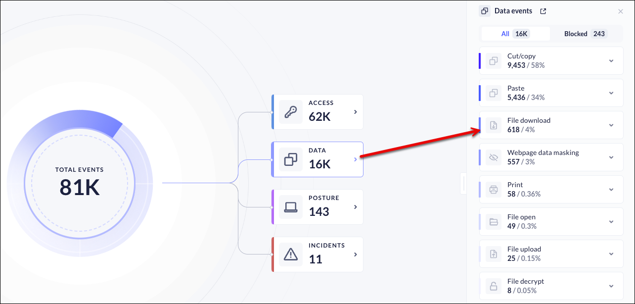 - Data events—Data events display the information regarding the operations that Prisma Browser perform most on data, such as copy, paste, download, or print.