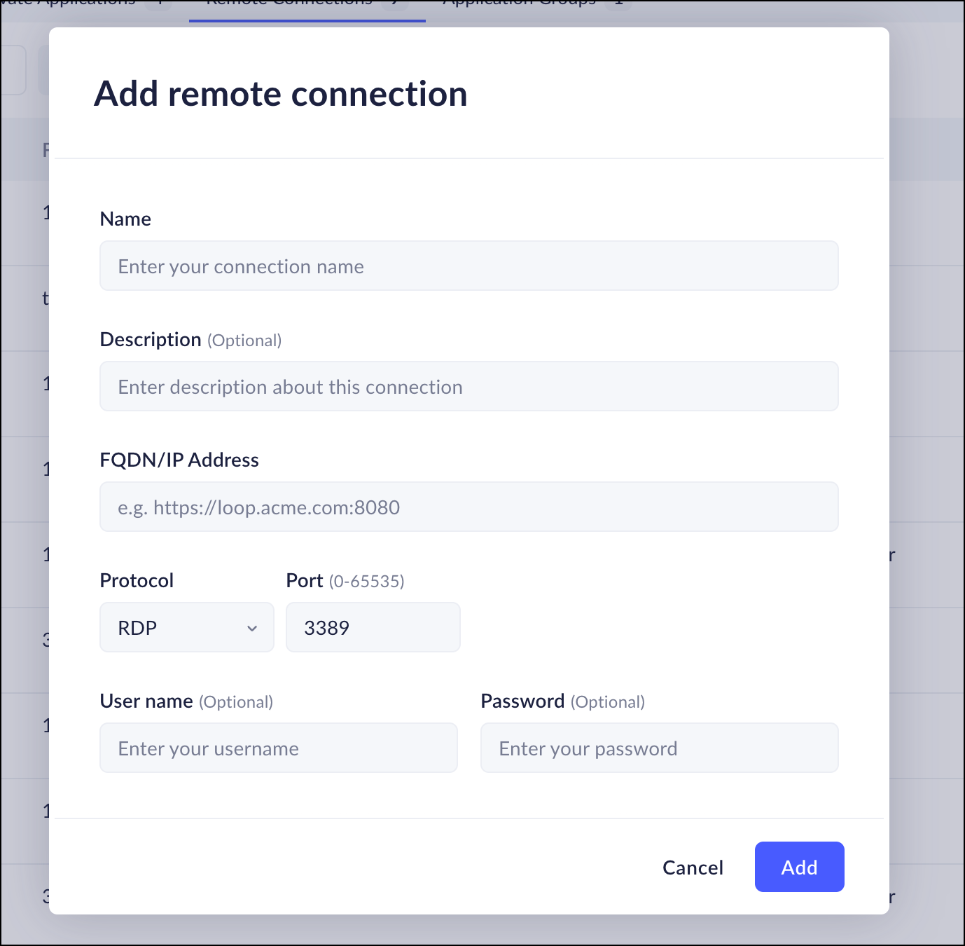 - Manual Connections: If permitted, users can create, edit, and delete their own remote connections. These manually created connections remain private and cannot be shared with other users.
