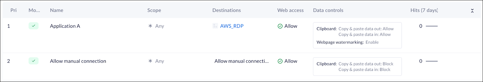 - Rule 1: Allow Remote Connection A, enable watermark, allow clipboard.