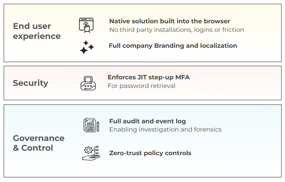 To address these challenges, we developed the Enterprise Password Manager as a first-party solution, purpose-built to meet the needs, and tightly integrated with Prisma Browser. The solution supports complex enterprise requirements by enabling robust security controls, seamless policy rule enforcement, and a streamlined user experience.