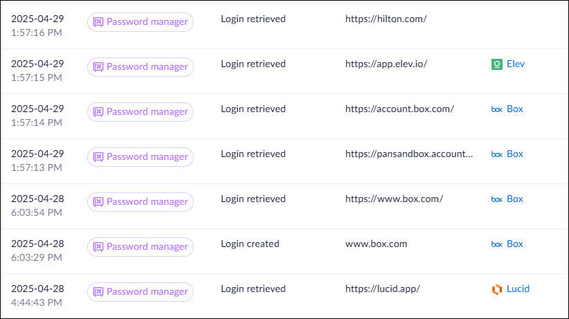 • Login retrieved - The system logs when a user retrieves a login by autofilling it or by using the eye icon or copy button to view or copy the credentials.