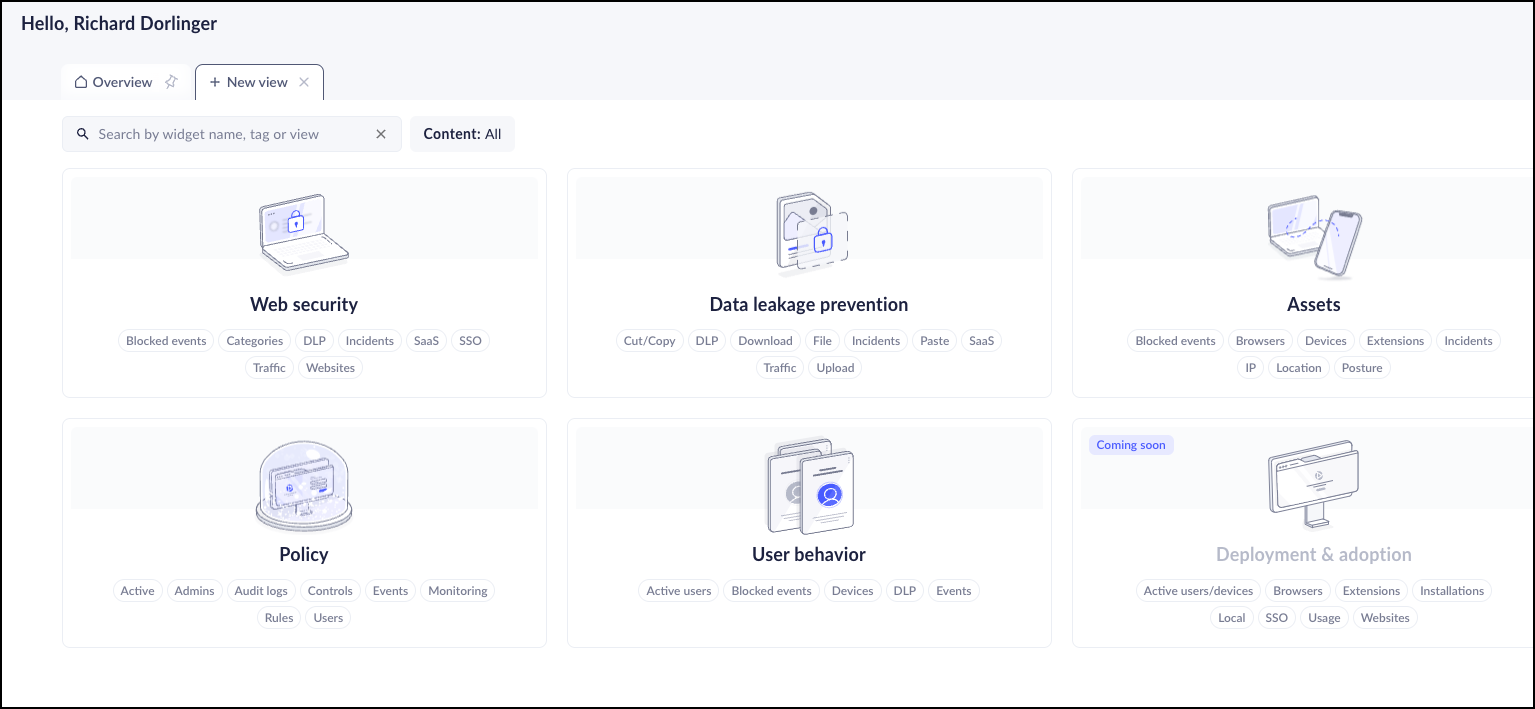 The Prisma Browser dashboards deliver real-time, relevant data, and metrics for various use cases, catering to the specific needs and interests of diverse user groups. Use the dashboards to derive meaningful insights from the analysis of user behavior and browsing data. There are a variety of dashboards for specific use cases you might want to monitor, such as user behavior, data leak prevention, web security, and policy. Each dashboard contains a collection of widgets and some of the widgets appear in multiple dashboards.
