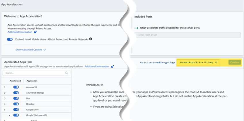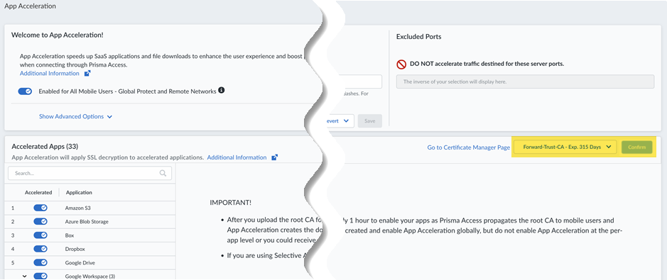 • Trusted Root CA Upload—You need to set up a trusted Root CA and perform a commit and push operation and then select it during App Acceleration setup, as shown in the following procedures. If using Strata Cloud Manager to configure App Acceleration, set up the Root CA in the Prisma Access scope. If you change the certificate you use, you must also commit and push the changed certificate before you select it.