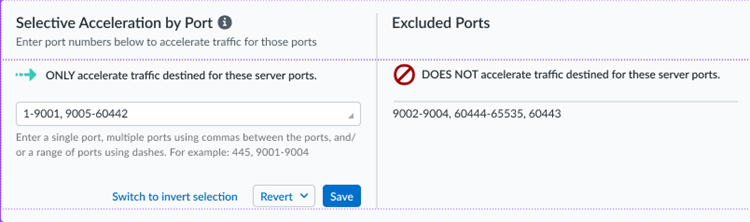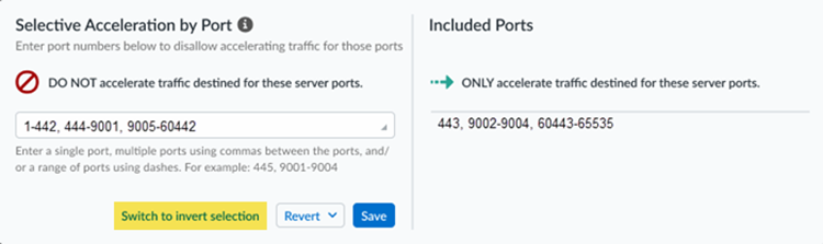 • To select the ports to exclude from acceleration, Switch to invert selection and enter the ports to exclude. App Acceleration accelerates every port you don’t select.