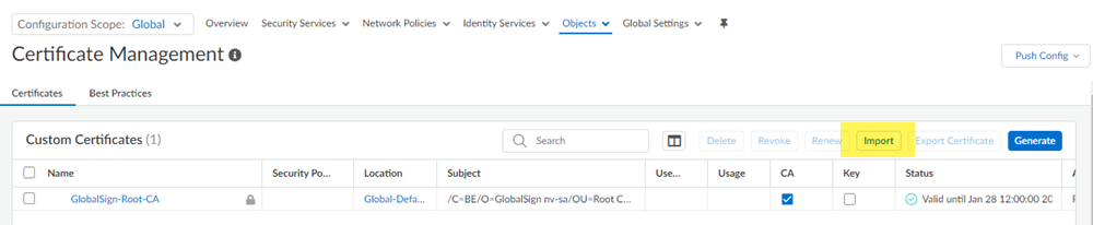 1. Go to ConfigurationNGFW and Prisma AccessObjectsCertificate Management.