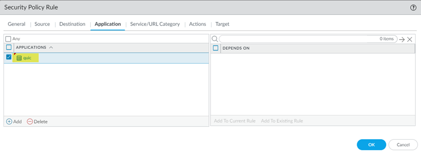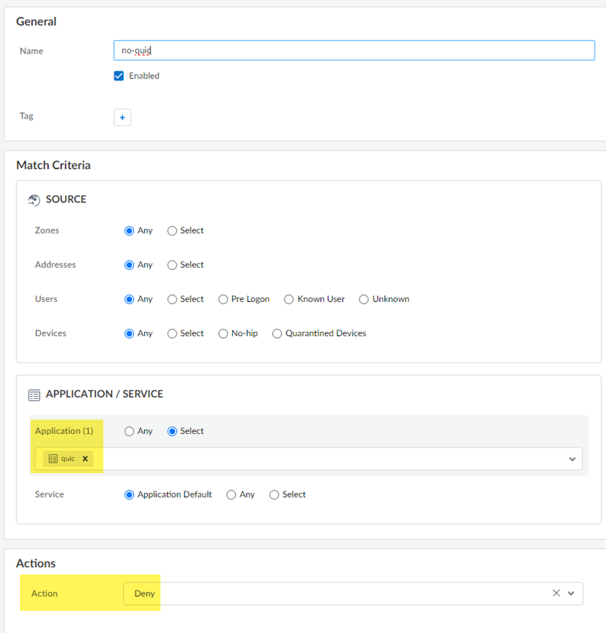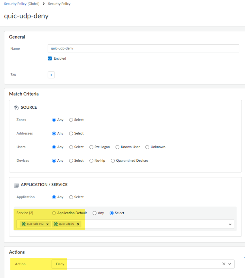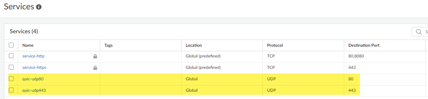 Newer versions of QUIC might be misidentified as unknown-udp. For this reason, Palo Alto Networks recommends adding services for UDP port 80 and UDP port 443 and creating an additional security policy to block UDP traffic on those ports.