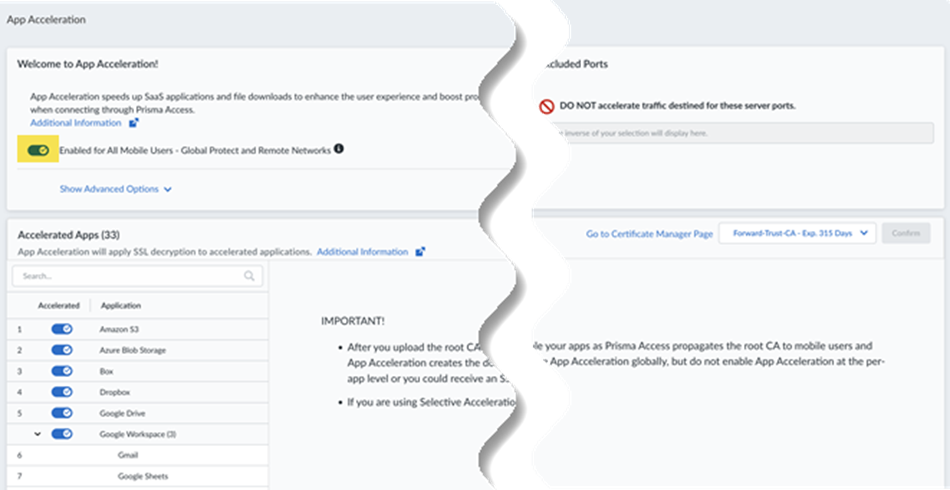 • App Acceleration requires a Prisma Access dataplane version of 10.2.10.