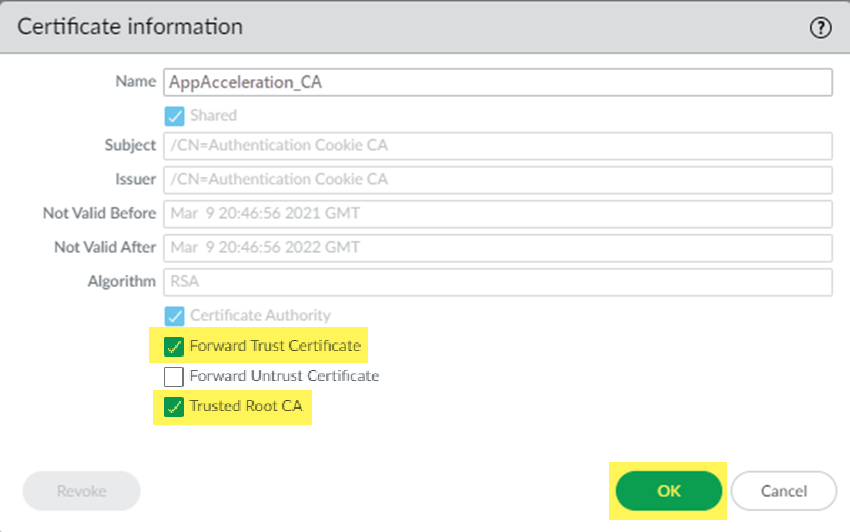 2. Select the certificate as a Forward Trust Certificate and Trusted Root CA and click OK.