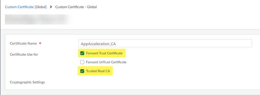 If you don't specify the certificate as a forward trust certificate and trusted root CA, users will encounter SSL errors when trying to access accelerated apps when using SSL decryption. If you have certificates in the Mobile_User_Template and Remote_Network_Template, perform this step in both templates.