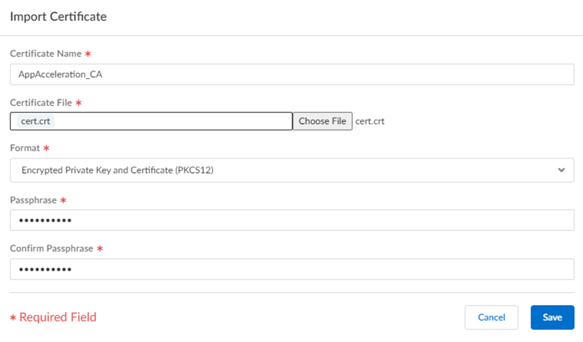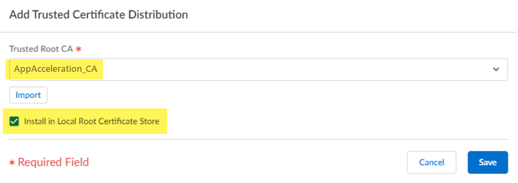 7. In the App Acceleration configuration, type the name of the certificate you created in an earlier step exactly as it's listed in Panorama.