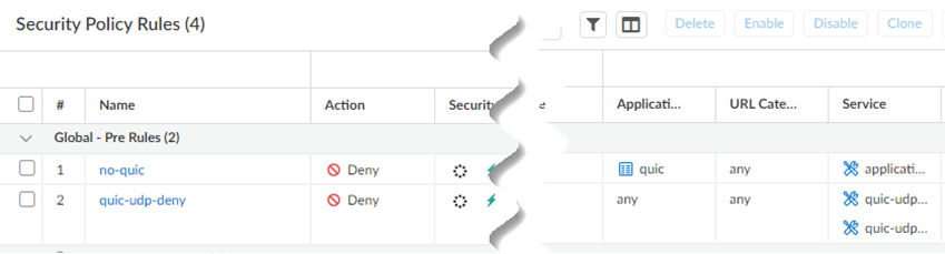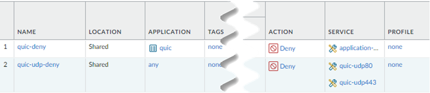 When completed, you will have two security policy rules: One that blocks the QUIC protocol and one that blocks traffic on UDP ports 80 and 443.