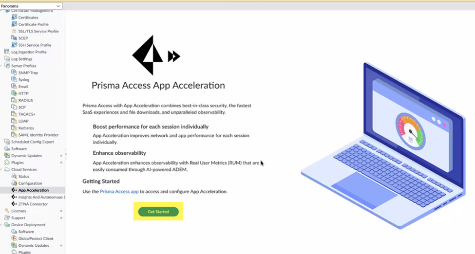 To configure App Acceleration in Prisma Access, select one of the following tabs depending on your deployment (Prisma Access (Managed by Strata Cloud Manager) or Prisma Access (Managed by Panorama)).