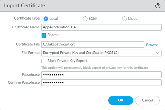 2. Import a root certificate authority (CA) certificate and private key in Panorama to use with App Acceleration and commit and push your changes.
