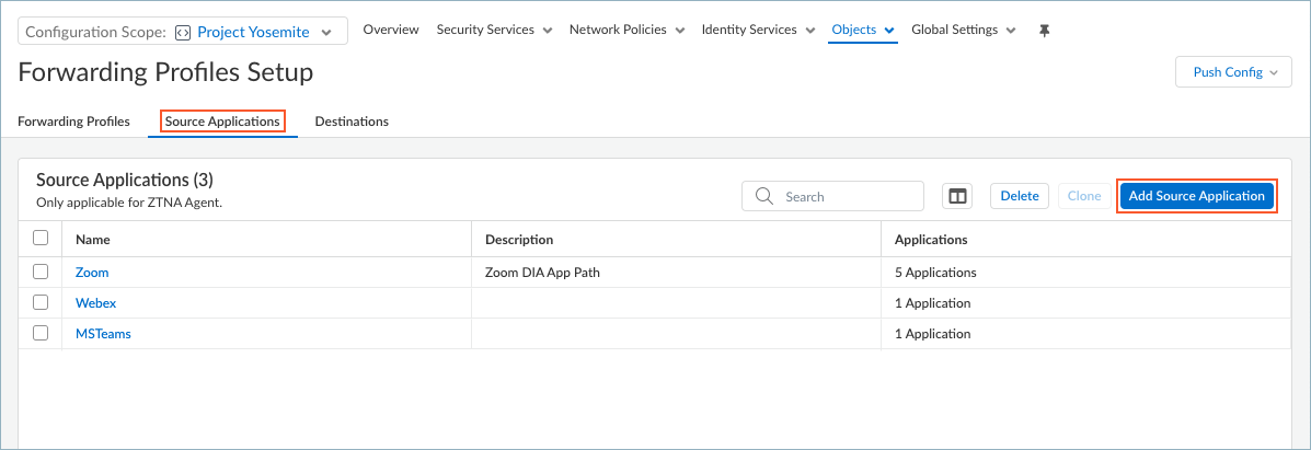 Set up Source Applications if you want to create split tunnels based on the SaaS or public cloud application name.- In the Forwarding Profiles Setup page, select Source ApplicationsAdd Source Application.