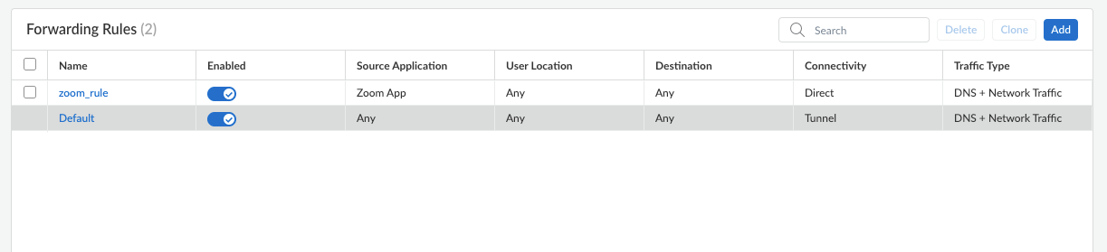 The Forwarding Rules table shows the rules that make up the forwarding profile. All forwarding profiles contain the Default forwarding rule, which sends all DNS and network traffic through the tunnel. Any new rules that you add are placed above the default rule. You cannot delete or move the default forwarding rule, but you can change its Connectivity setting.Enter the specifications for the forwarding rule.