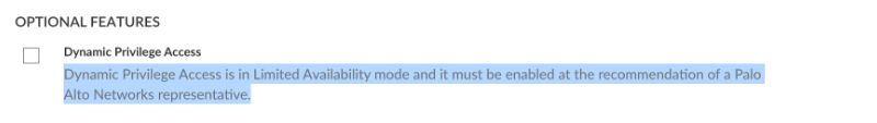 - Contact your Palo Alto Networks account representative to activate this functionality for your tenant.Activate the license for your Prisma Access (Managed by Strata Cloud Manager).Ensure to allocate licenses, plan your service connections, and add additional locations accordingly.Enable available add-ons.Select the check box for Dynamic Privilege Access.