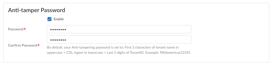 To unlock the anti-tamper feature to troubleshoot the Prisma Access Agent, you need to set up an anti-tamper unlock password (also known as the supervisor password).- Enable the anti-tamper unlock password.If you don't enable the anti-tamper password, no password is assigned, and a user can enter any password (including an empty password) when prompted at the Prisma Access Agent command line.If you disable the anti-tamper password after enabling it, users can run certain PACli commands on the agent, such as the pacli disable, pacli hip status, pacli protect disable, and pacli switchto GlobalProtect commands, without providing the supervisor password. They only need to press Enter when prompted for the password.Enter the Password, and then Confirm Password by reentering the password. The password must have a minimum of eight alphanumeric characters.