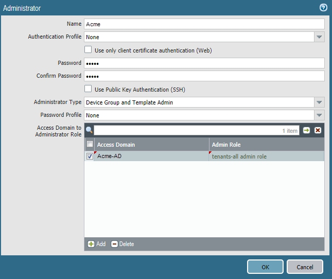 Create and configure an Administrator for the tenant.- Select PanoramaAdministrators.Add an Administrator.Enter and confirm a Password for the new Administrator.Specify an Administrator Type of Device Group and Template Admin.Specify the Access Domain that is associated with the device groups for that tenant.