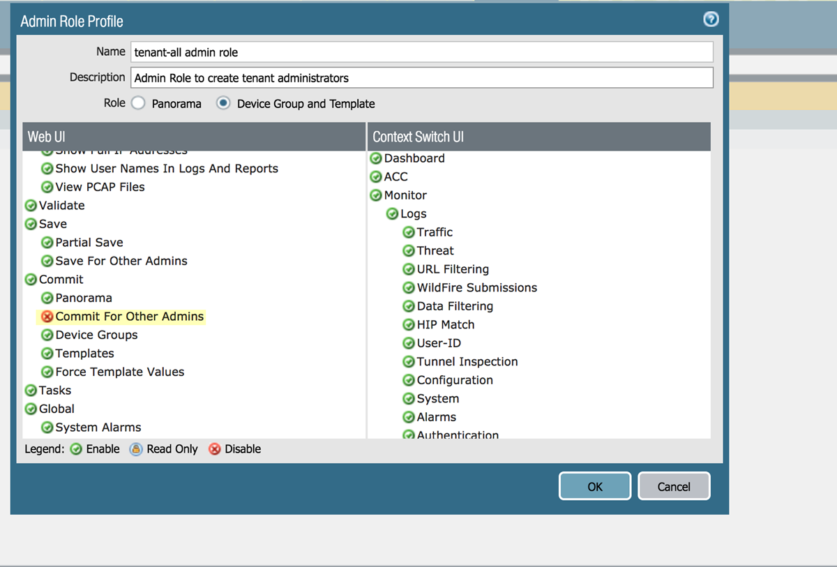- Select PanoramaAdmin Roles.Add an Admin Role Profile with a Role of Device Group and Template.Click OK.You can create a single Admin Role Profile and share it across multiple tenants; however, you must create a separate administrator for each tenant.While you tailor the administrative role for the needs of your organization, we recommend deselecting Commit for Other Admins. Deselecting this choice allows a tenant-level user to commit only the changes they have made, and prevents them from unintentionally committing other changes that other tenant-level administrative users have made that are not yet committed.