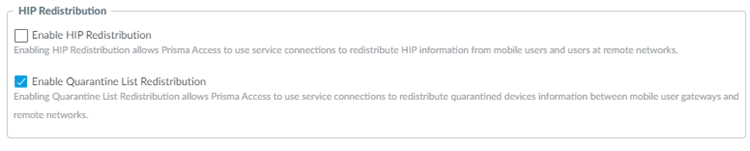 Allow Prisma Access to redistribute quarantine list information.- In Panorama, select PanoramaCloud ServicesConfigurationService Setup.Click the gear icon to edit the settings.In the Advanced tab, select Enable Quarantine List Redistribution.Enabling quarantine list redistribution allows Prisma Access to redistribute the quarantine list information received from one or more mobile user locations (gateways) to service connections.