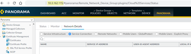 Repeat Step 5 for all the service connections in your Prisma Access deployment.Select CommitCommit to Panorama to save your changes locally on the Panorama that manages Prisma Access.Configure a data redistribution agent that redistributes quarantine list information from Panorama to the service connections.- Find the management IP address of the Panorama that manages Prisma Access.This address displays by in the web browser address bar when you access Panorama.