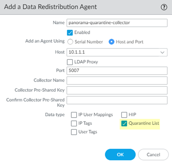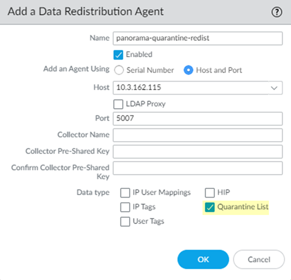 Configure a data redistribution agent that redistributes quarantine list information from the service connections to Panorama.- From the Panorama that manages Prisma Access, select PanoramaCloud ServicesStatusNetwork DetailsService Connection.Make a note of the User-ID Agent Address (PanoramaCloud ServicesStatusNetwork DetailsService ConnectionUser-ID Agent Address) for each service connection.Select PanoramaData RedistributionAgents.Add a Data Redistribution agent, give it a Name and select Enabled.Enter the User-ID Agent Address of the service connection as the Host and 5007 as the Port.Make sure that your network does not block access to this port between Panorama and Prisma Access.(Optional) If you have configured this service connection as a Collector (DeviceData RedistributionCollector Settings), enter the Collector Name and Collector Pre-Shared KeySelect Quarantine List; then, click OK.