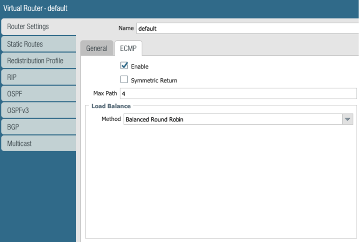 Configure ECMP on the CPE in the remote network site.- Select NetworkVirtual Routers.Select the default virtual router, or Add a new virtual router.Select Router SettingsEnableECMP, then Enable ECMP with a Max Path of 4 and a load balance Method of Balanced Round Robin.