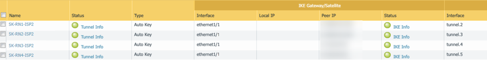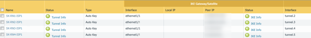 - Create four active tunnels from the active CPE to each of the four network connections. For the Peer IP address, enter the Service Endpoint Address of the remote network you received from Prisma Access in a previous step.