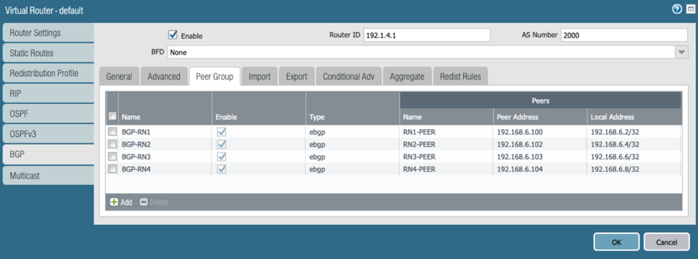 Select BGPPeer Group, Enable BGP on the virtual router instance, then Add Remote Network BGP peers.