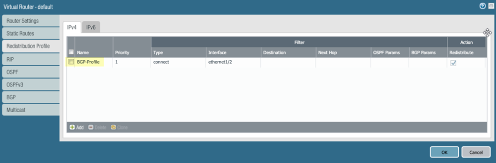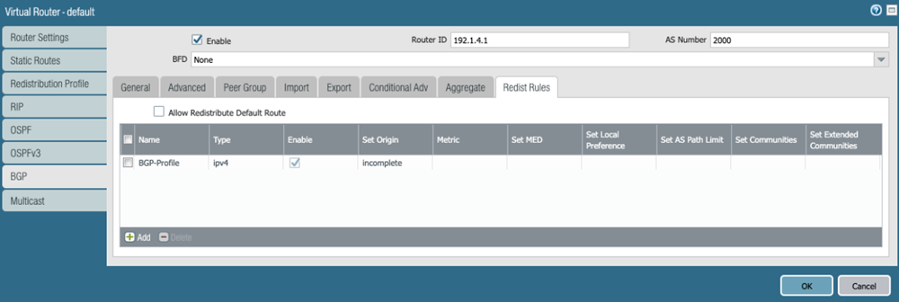 Select BGPRedist Rules, then attach the route redistribution profile you created in a previous step.