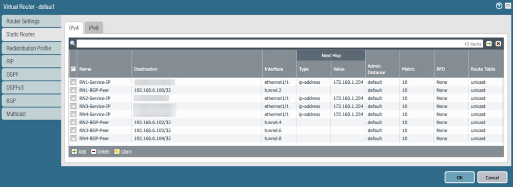 On the CPE in the remote network site, create static routes to the Prisma Access Service Endpoint Address and EBGP Router IP addresses you retrieved in a previous step.As previously stated, dynamic routing with BGP is required for this configuration. To facilitate BGP connection between the CPE and Prisma Access’ eBGP router, you need to add a static route for the eBGP router IP address on the CPE, and the next-hop must be the tunnel interface on the CPE. You must repeat this step for all other Remote Network eBGP router IP addresses on remaining tunnels.The following example shows the route on the active CPE. If you created backup tunnels on a standby CPE, create the same routing on the standby CPE.If you are configuring a Palo Alto Networks next-generation firewall, select Static RoutesIPv4 to add the static routes.