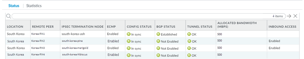 Validate that the CPE is passing traffic on all four of its tunnels.Check the status of the ECMP-enabled connections from Prisma Access.- Select PanoramaCloud ServicesMonitorRemote Networks, select the region where you deployed the ECMP connections, then select Status.
