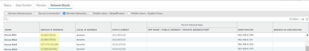 Select PanoramaCloud ServicesStatusNetwork DetailsRemote Networks and make a note of the Service Endpoint Address and EBGP Router addresses.You use the Service Endpoint Address as the peer FQDN or IP address when you configure the IPSec tunnel on the CPE in the remote network site, and you use these addresses and the EBGP Router addresses when you create static routes on the CPE.