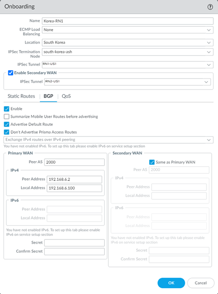 - Enable BGP, Advertise Default Route, and Don’t Advertise Prisma Access Routes.
