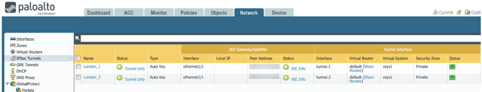 If you use a next-generation firewall as the CPE, select NetworkIPSec Tunnels and create two tunnels for the service connections (tunnel.1 and tunnnel.2 in the following screenshot).